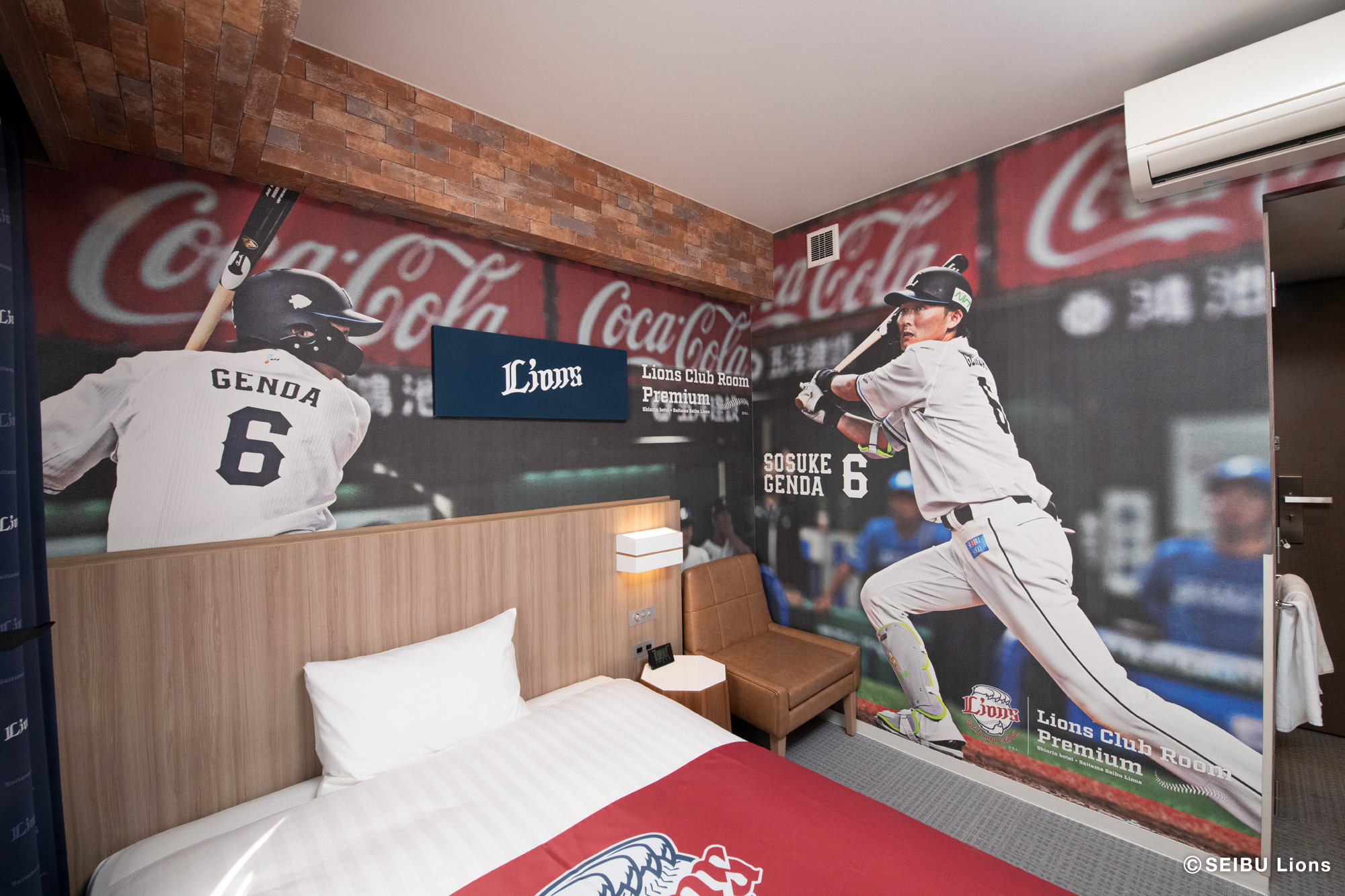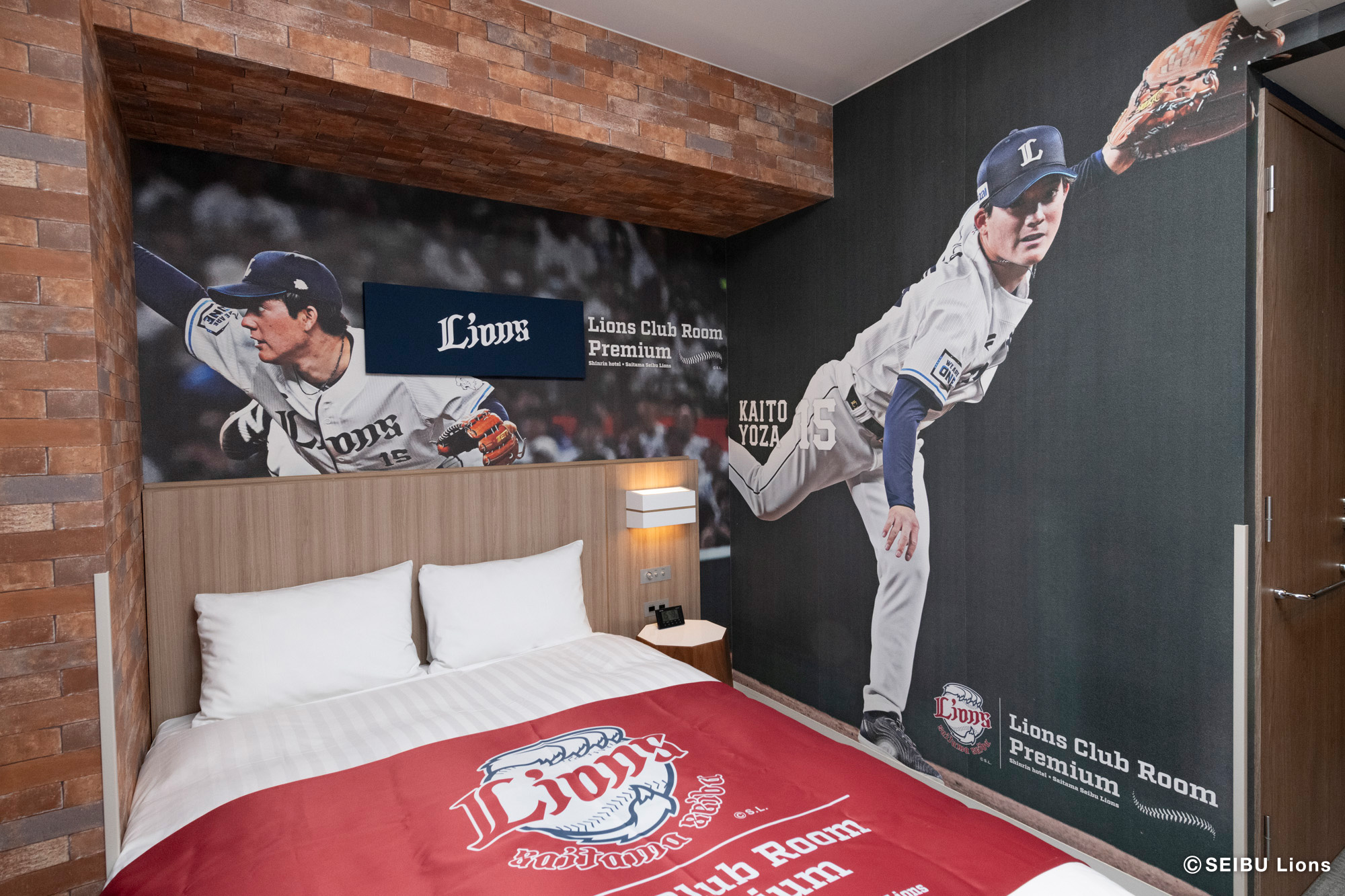 本コンセプトルームは、当館2Fに専用フロアを有し、「ライオンズクラブルーム・プレミアム」と称する6室には、各部屋ごとに埼玉西武ライオンズの選手が壁一面に印刷されています。さらに、オリジナルデザインのカーテンやベッドスローをはじめ、備品やアメニティにもこだわり、まさに埼玉西武ライオンズ一色に染まった、ファンにはたまらない特別な客室となっております。